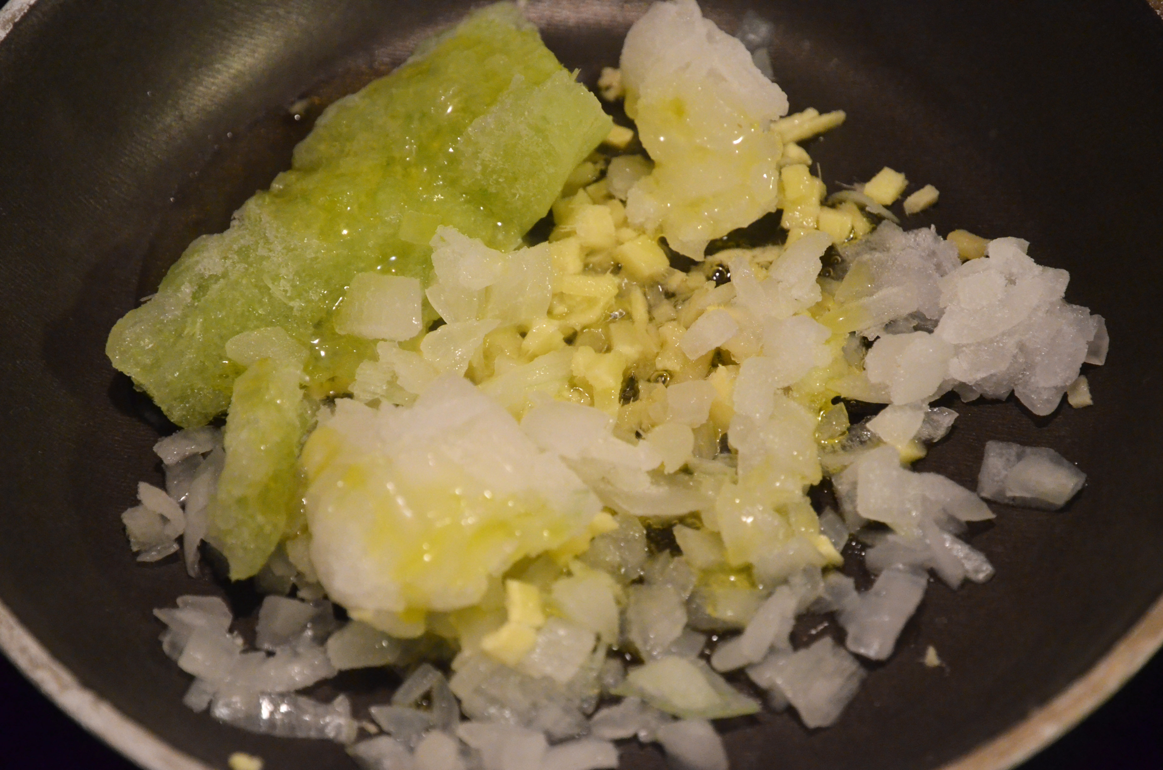 In a large, non-stick pan, add a spoonful of olive oil, the chopped onion and ginger. Let them cook until the onion become translucent.
