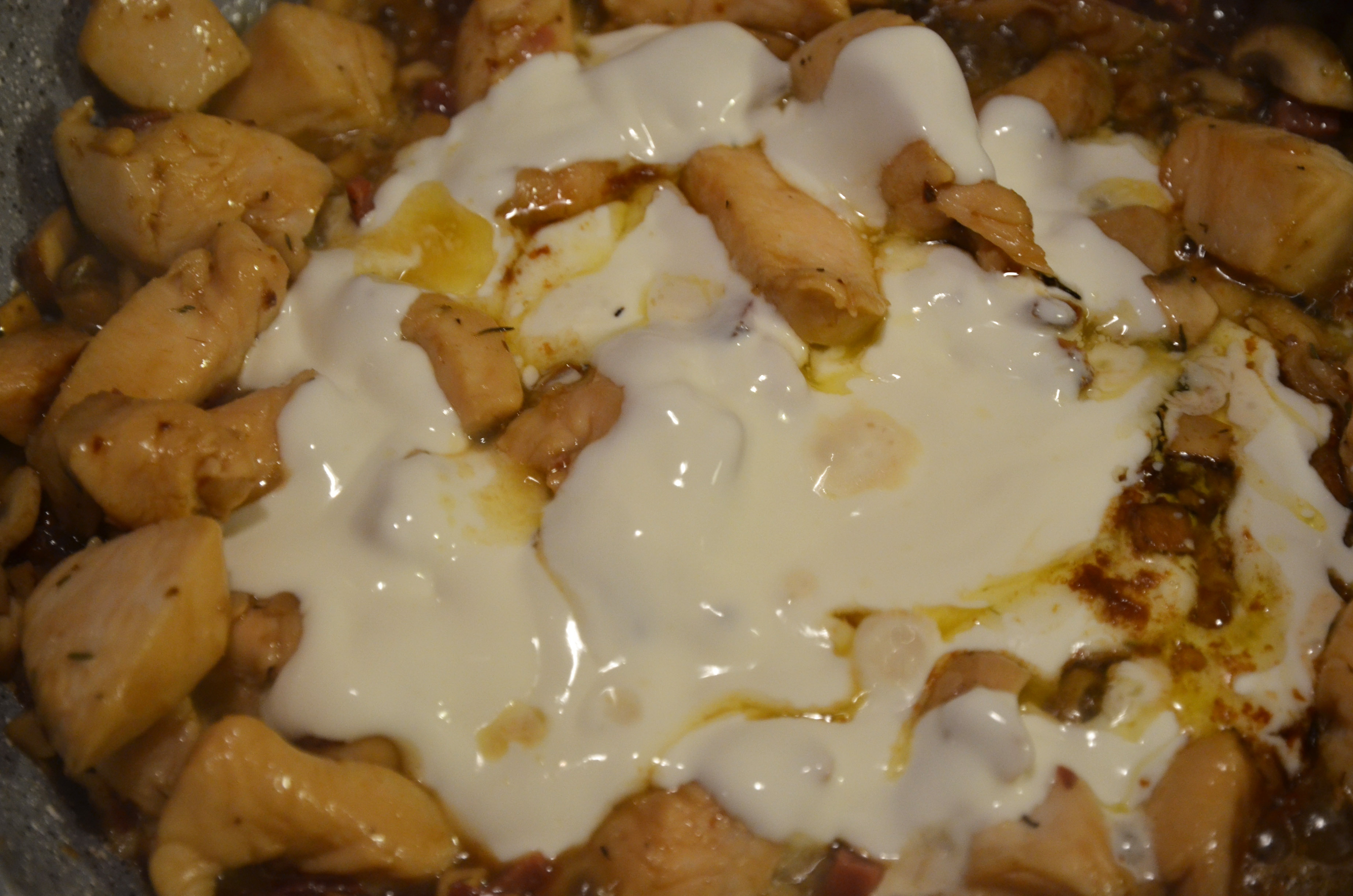 Let the chicken absorb this and add half a glass of heavy cream. Taste for seasoning!
