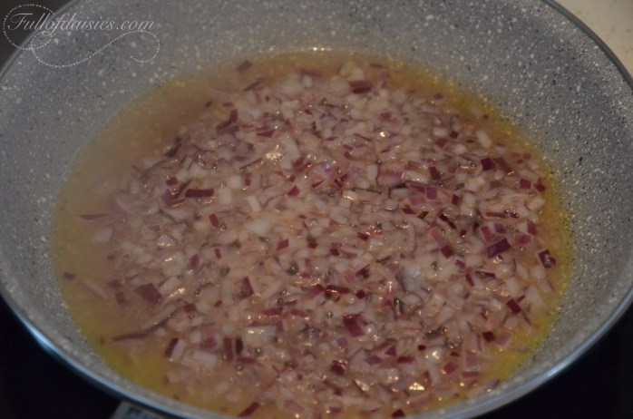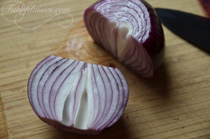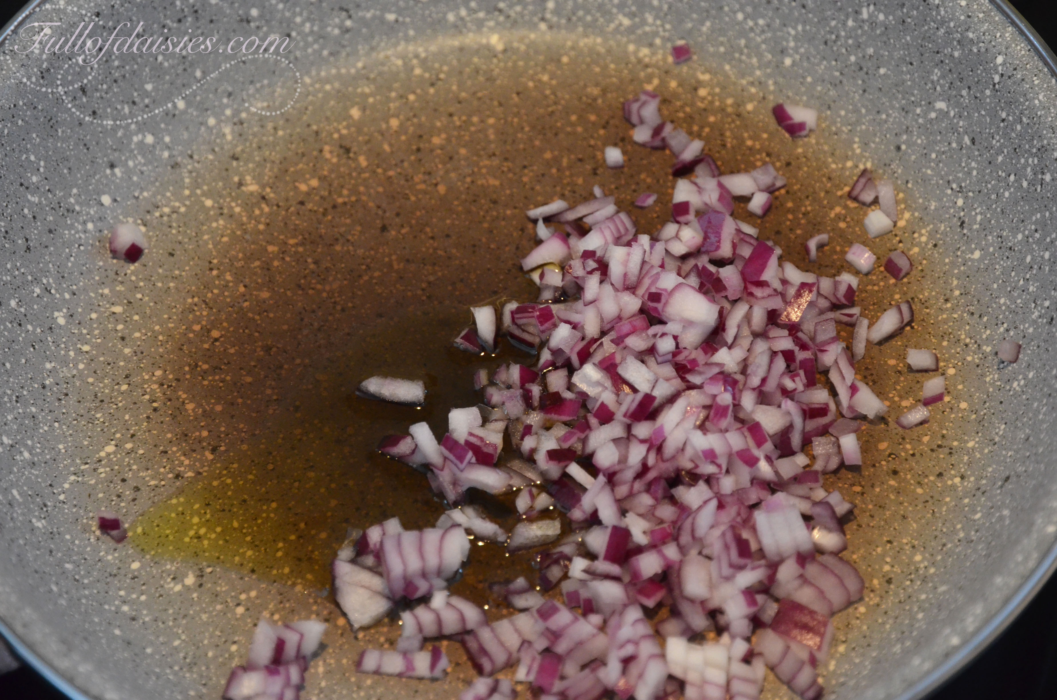 A spoonful of olive oil in a non-stick pan will help the red onion become translucent.