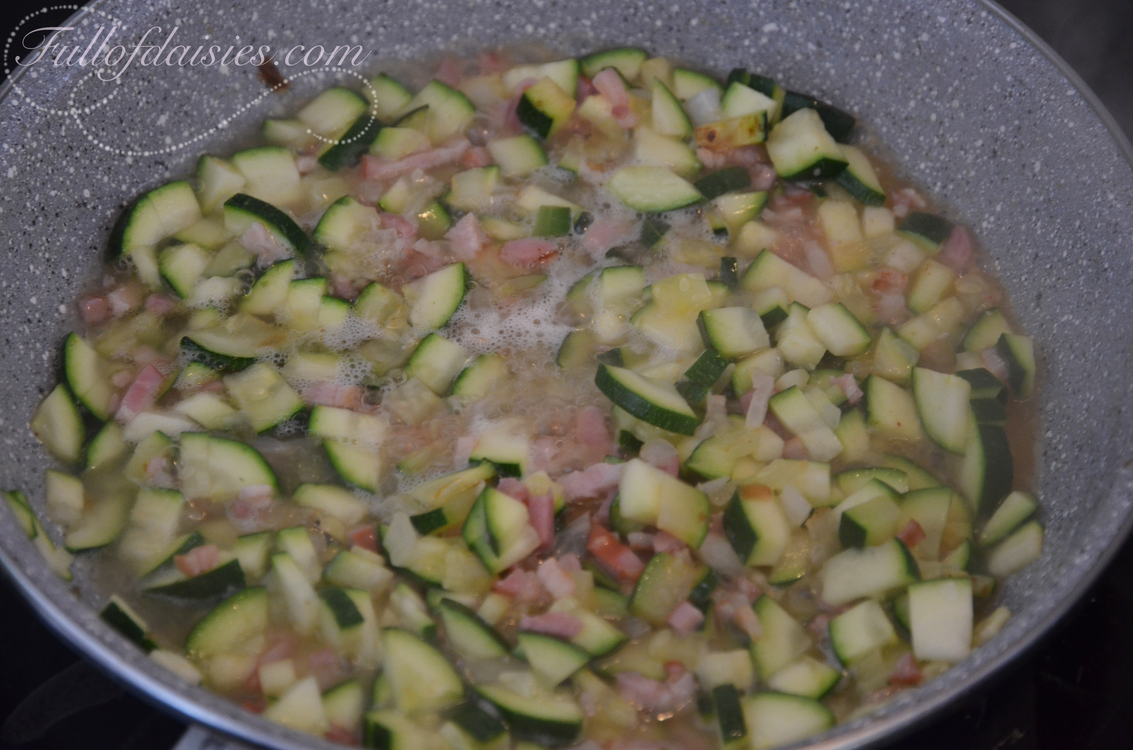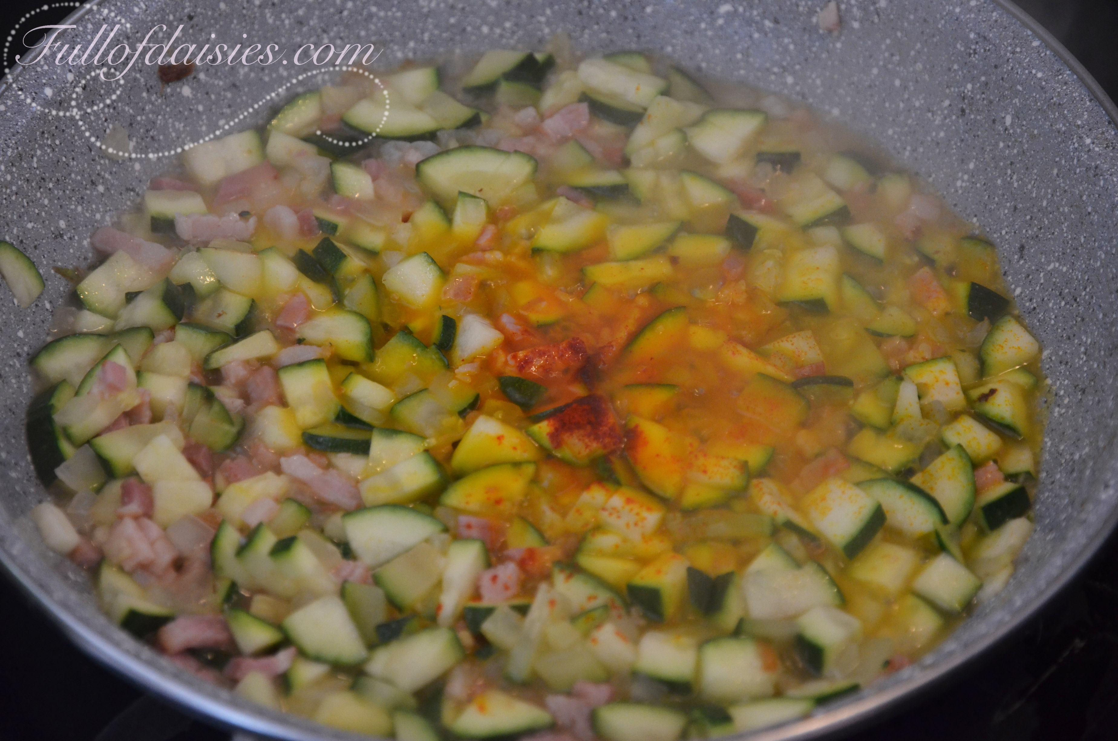 Add a spoonful of olive oil in a non-stick pan (of course) and add the onion, zucchini and bacon. Cook for about 4 minutes.