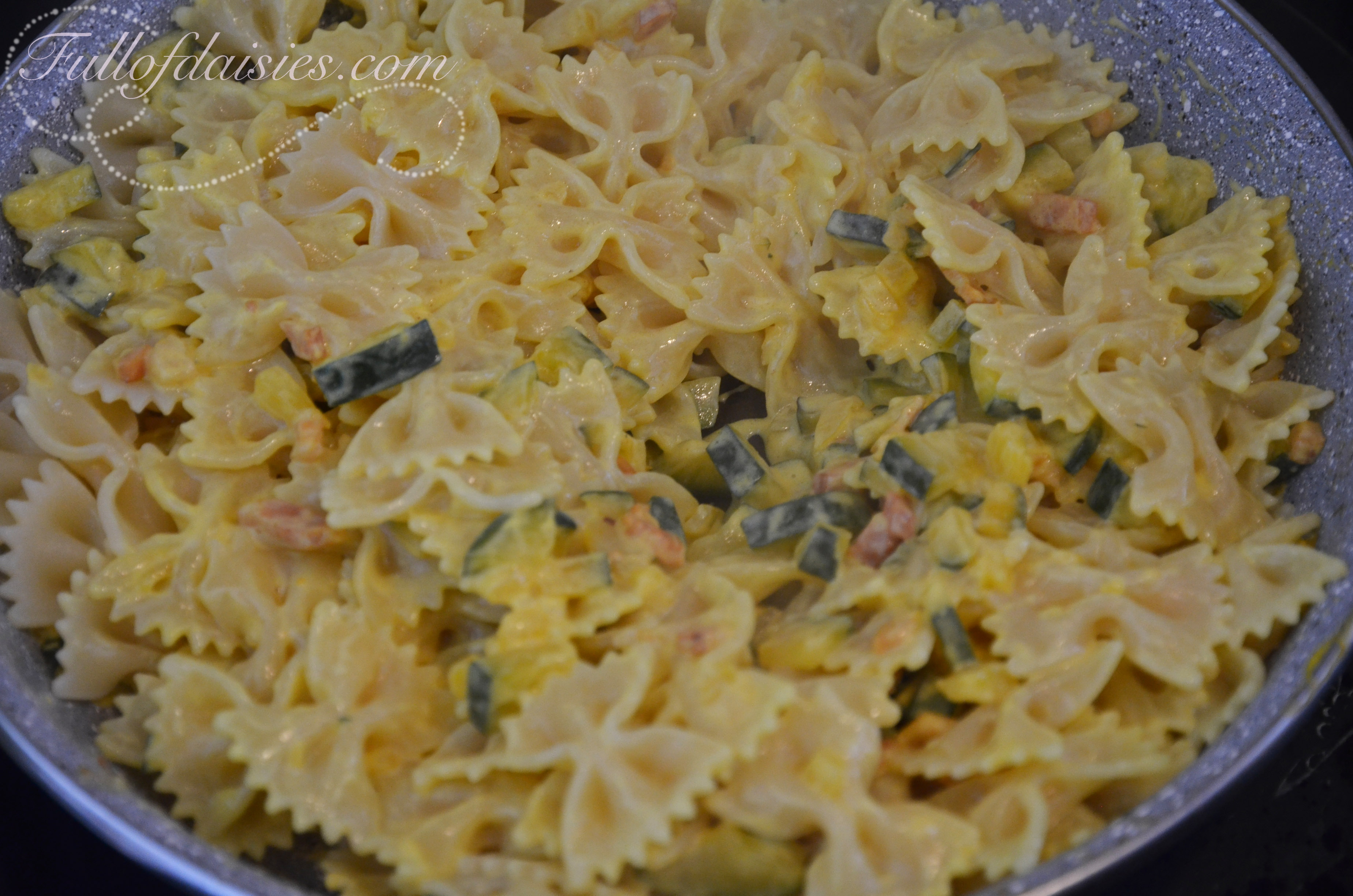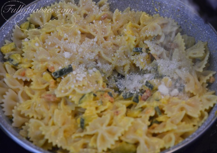 Strain the pasta (you were boiling the pasta at the same time, weren’t you?) and mix on low low heat for about a minute