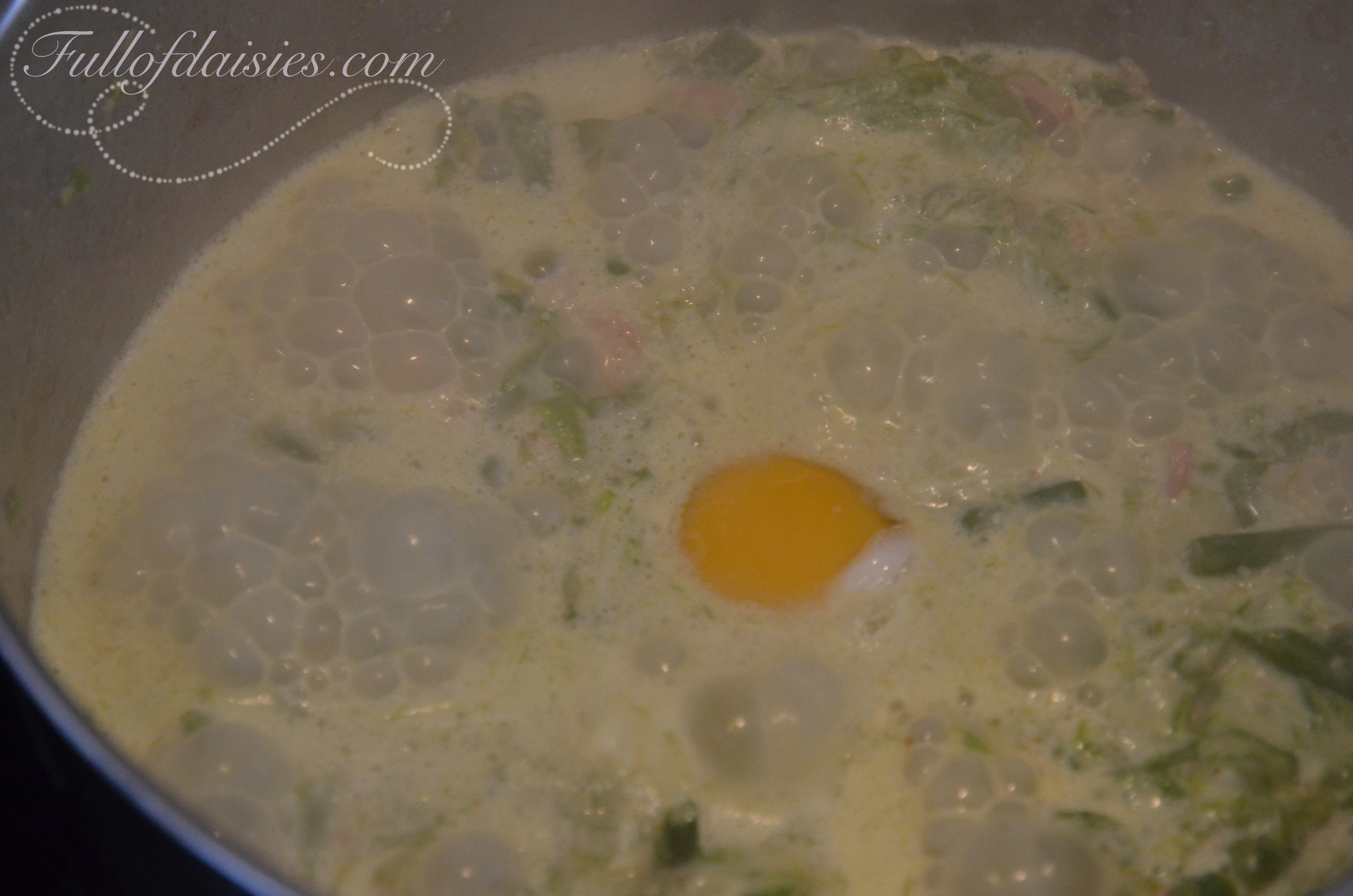 Let the cream come to a boil so that the white cooks but the yolk stays runny, then plate and cover it with parmesan 😉
