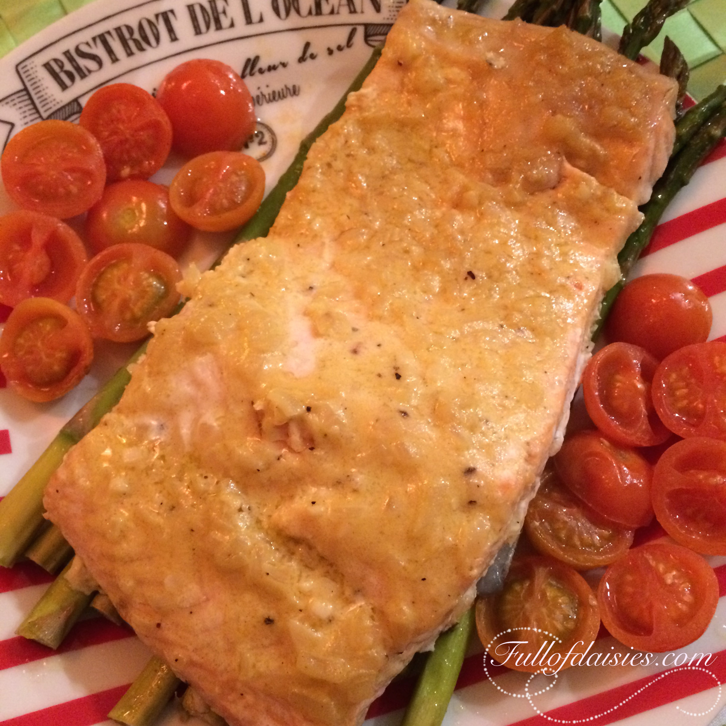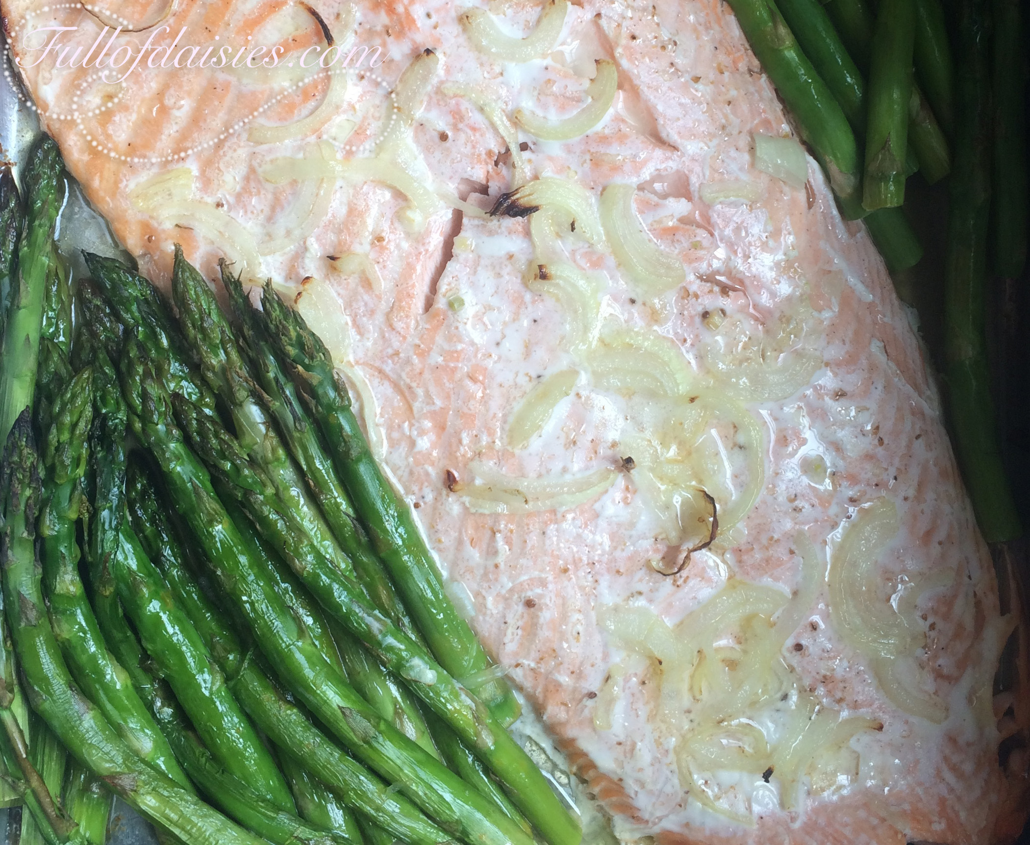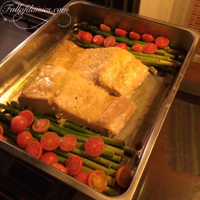 Apart from salmon, I also discovered baked asparagus with this recipe. I used to eat mushy, boiled asparagus but when you bake them, they cook but stay crunchy, just like I like them! So if you’re into crunchy asparagus or slow cooked cherry tomatoes, toss them with some oil and salt (not too much!) and place them on both sides of the salmon to cook together.