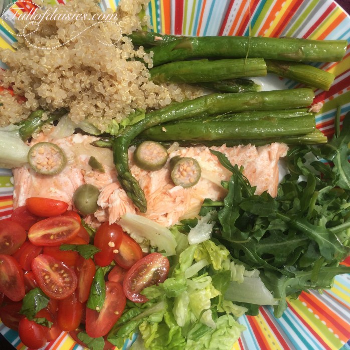 This is the first time I made salmon filet, just like that, in the oven. And it was so good, I made it again! So here is my easy easy recipe with lots of sides – because I love having a choice as to what I can eat with my protein – that are all incredibly simple to make.